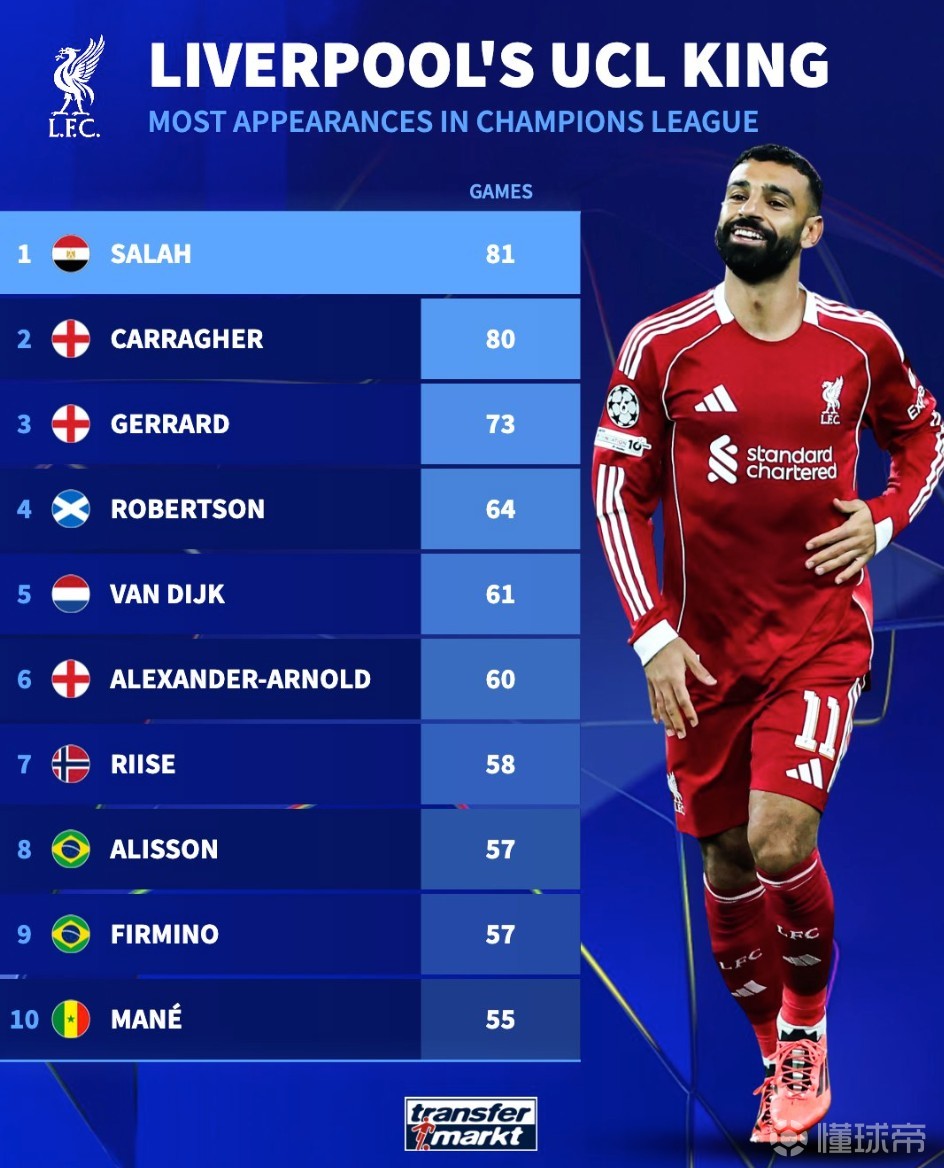 • 德转统计利物浦队史欧冠出场数前10:萨拉赫81场超卡拉格排第1
